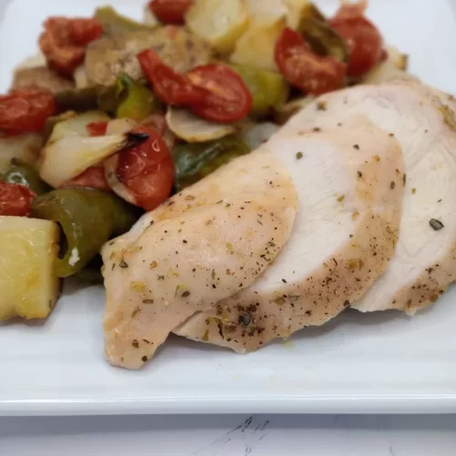 This recipe features tender boneless chicken breasts, tossed with healthy vegetables, like sweet onions, vibrant bell peppers, cherry tomatoes, and hearty potatoes, all lightly seasoned with classic Italian flavors like oregano and garlic powder.